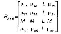 即認(rèn)為結(jié)果為決策j的可能性為μij,記作向量μi1,μi2,μi3,…μin,則m個(gè)傳感器構(gòu)成A×B的關(guān)系矩陣為: