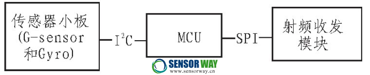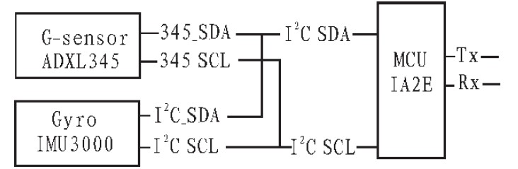 智能遙控器有許多功能,這里主要研究體感游戲手柄功能的設計與實現(xiàn)。涉及到的芯片主要有六軸傳感器———三軸加速計(G-Sensor)和三軸陀螺儀(Gyro)與MCU,采用的加速計是ADXL345,陀螺儀是IMU3000,MCU 是IA2E。Dongle 端采用的MCU 也是IA2E。