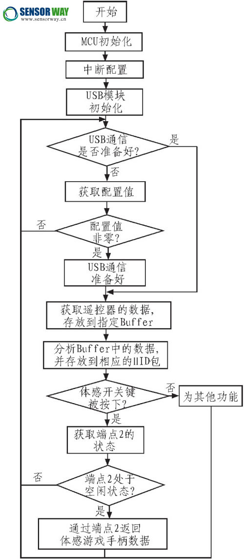 在本系統(tǒng)中,通過在芯片的集成開發(fā)環(huán)境中添加USB 模塊,根據(jù)實現(xiàn)設備的功能特點,做出相應設置并編譯,實現(xiàn)設備枚舉過程的功能及所需的代碼, 然后再根據(jù)設備的實際需求做相應的修改, 在Dongle 端程序的主函數(shù)中初始化USB 模塊,就可以實現(xiàn)電視機識別Dongle,進而識別出體感游戲手柄設備。Dongle 端程序主流程圖如圖4 所示。進入主函數(shù),MCU 首先完成一系列初始化,包括中斷配置和USB模塊初始化(開始枚舉過程)。然后程序就處于一個無限循環(huán)中,實現(xiàn)電視機和設備之間的實時通信。