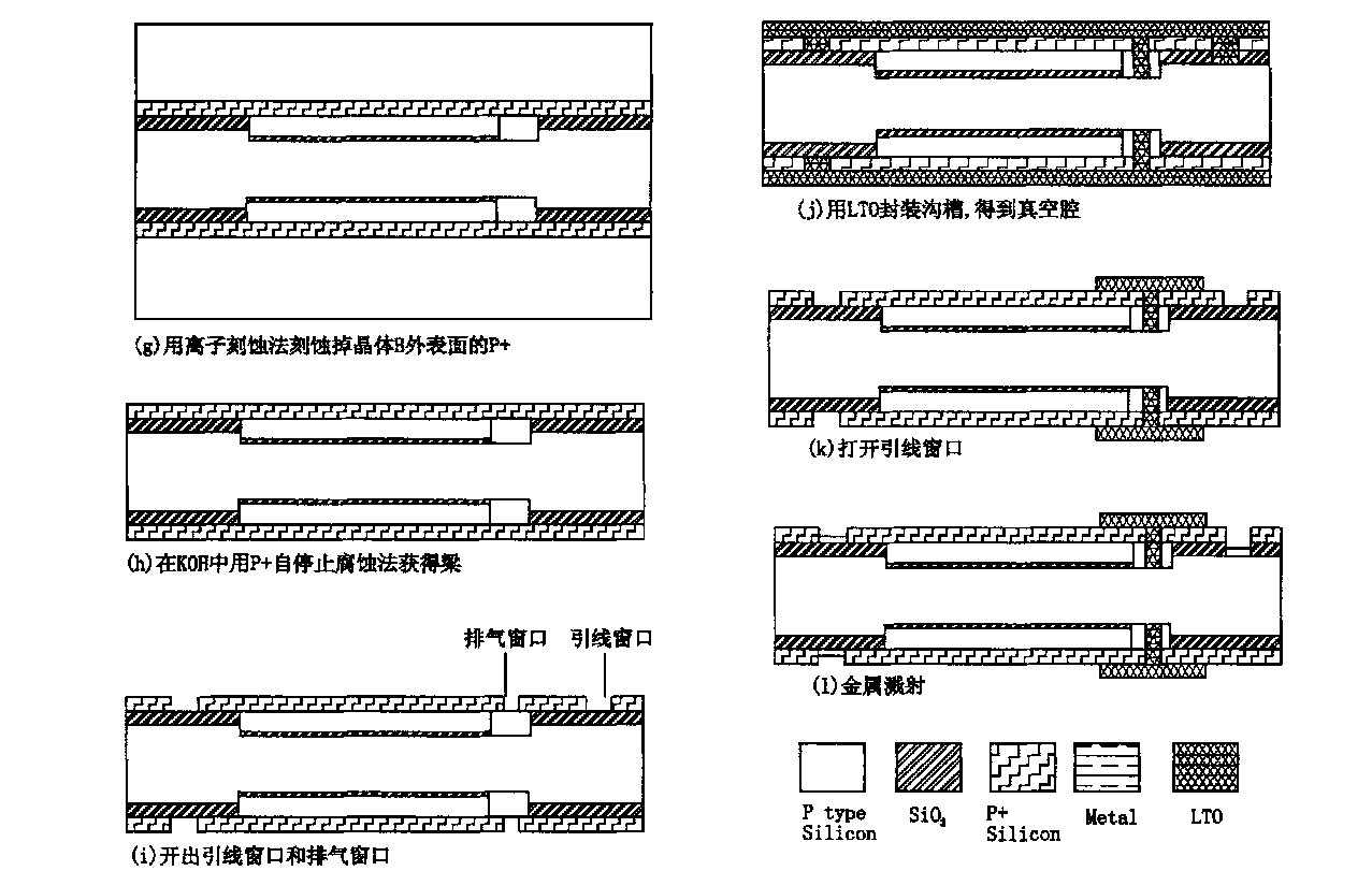 排氣窗口刻蝕出以后,用LTO封裝這個(gè)排氣窗口,用LTO封裝以后,腔里的空氣壓力幾乎為零。那么這個(gè)傳感器就可以測(cè)絕對(duì)壓力。