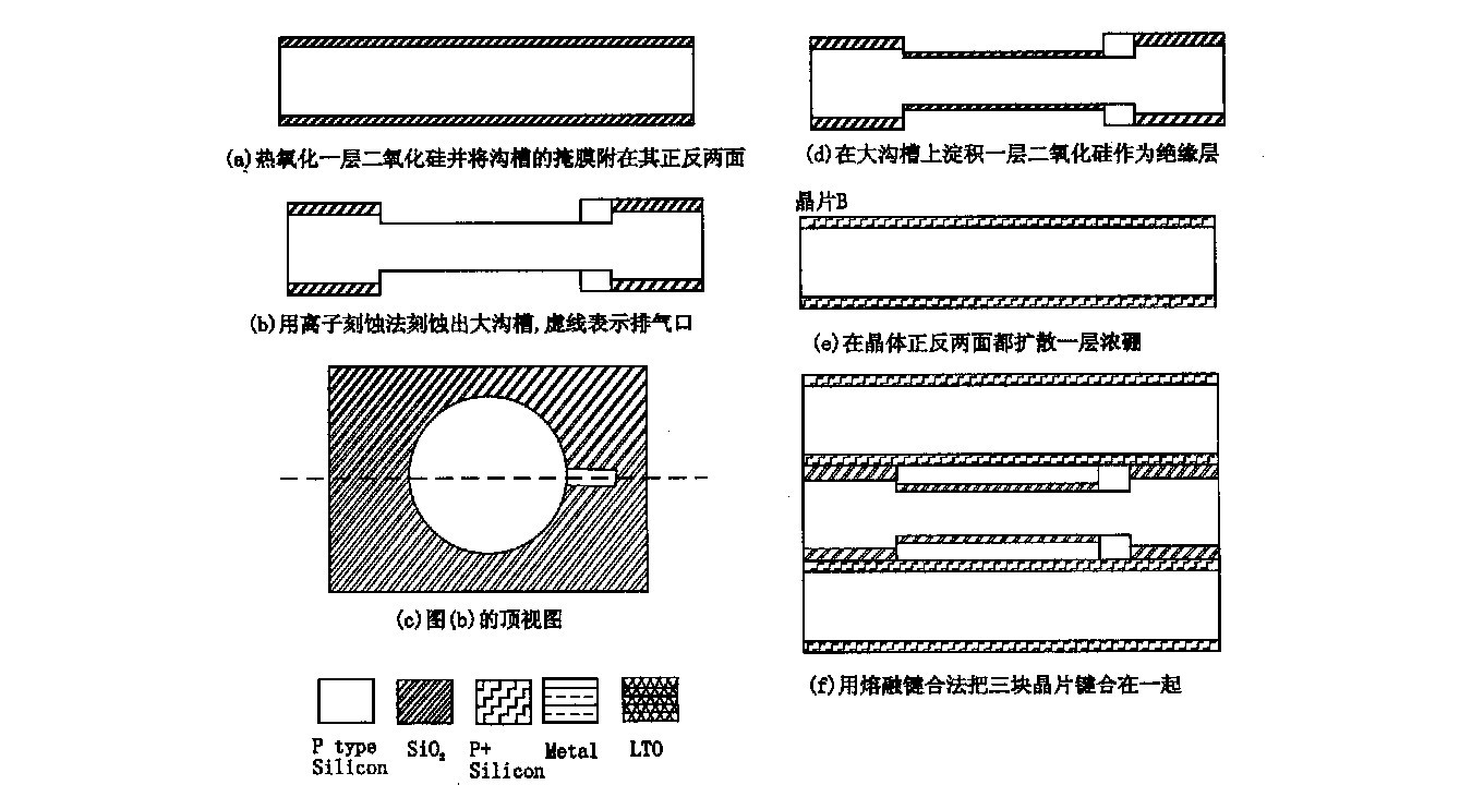 先在晶片A的兩端氧化出2μm的氧化層,然后把預(yù)先設(shè)計(jì)好的掩膜(即大溝槽的形狀)附在晶片A的正反兩面,然后放到SF6溶液里面讓它進(jìn)行腐蝕,就可得到所要的大溝槽(真空腔)的形狀。