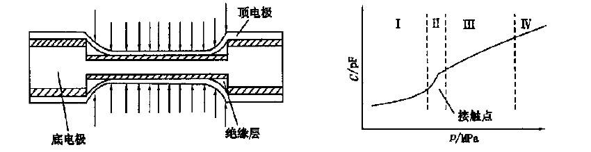 圖1 雙面接觸式電容壓力傳感器的結(jié)構(gòu)及工作曲線圖