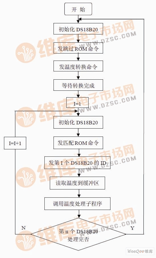 單總線多點測溫的設計思想是:當主機需要對眾多在線的DS18B20 中的某一個進行操作時,首先要發(fā)出匹配ROM 命令,緊接著主機把從EEPROM 中取出存儲的64 位序列號發(fā)送到總線上,只有具有此序列號的DS18B20 才接受與相應主機的命令,之后操作就是針對該DS18B20 的。如圖3 所示的流程圖,其中的跳過ROM 命令,就是此后的操作是針對所有DS18B20 的。在DS18B20 組成的多點測溫系統(tǒng)中,先發(fā)送跳過ROM 命令,即是啟動所有的DS18B20 進行溫度轉換,然后,再通過匹配ROM 命令,逐一讀取每個DS18B20的溫度數(shù)據(jù)。