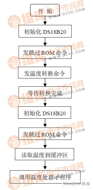 其上傳輸?shù)氖且幌盗械拿}沖信號。使用DS18B20 進行溫度測量的步驟為:初始化DS18B20→跳過ROM 操作命令→啟動溫度轉換命令→等待轉換完成→初始化→跳過ROM 操作命令→讀取溫度寄存器命令,這樣就可以讀出被測溫度的數(shù)據(jù)了。