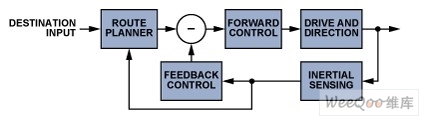 機(jī)器人的移動(dòng)通常是從管理機(jī)器人總體任務(wù)進(jìn)度的中央處理器發(fā)出位置變化請(qǐng)求時(shí)開(kāi)始的。導(dǎo)航系統(tǒng)通過(guò)制定行程計(jì)劃或軌跡以開(kāi)始執(zhí)行位置變化請(qǐng)求。行程計(jì)劃需考慮可用路徑、已知障礙位置、機(jī)器人能力及任何相關(guān)的任務(wù)目標(biāo)。(例如,對(duì)于醫(yī)院里的標(biāo)本遞送機(jī)器人,遞送時(shí)間非常關(guān)鍵。)行程計(jì)劃被饋入控制器,后者生成傳動(dòng)和方向配置文件以便進(jìn)行導(dǎo)航控制。這些配置文件可根據(jù)行程計(jì)劃執(zhí)行動(dòng)作和進(jìn)程。該運(yùn)動(dòng)通常由若干檢測(cè)系統(tǒng)進(jìn)行監(jiān)控,各檢測(cè)系統(tǒng)均產(chǎn)生反饋信號(hào);反饋控制器將信號(hào)組合并轉(zhuǎn)換成更新后的行程計(jì)劃和條件。圖2是一般導(dǎo)航系統(tǒng)的基本框圖。