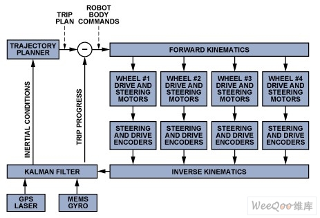 每個(gè)車(chē)輪的驅(qū)動(dòng)軸和轉(zhuǎn)向軸編碼器測(cè)量結(jié)果在正向運(yùn)動(dòng)學(xué) 處理器中用阿克曼轉(zhuǎn)向公式進(jìn)行組合,從而產(chǎn)生駛向、偏轉(zhuǎn)速率、位置和線速度等測(cè)量數(shù)據(jù)。