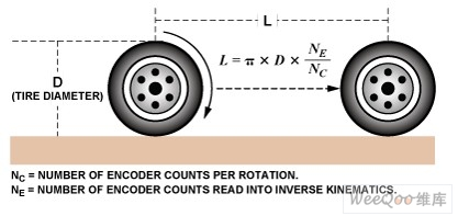 測(cè)程反饋系統(tǒng)利用光學(xué)編碼器對(duì)驅(qū)動(dòng)和轉(zhuǎn)向軸旋轉(zhuǎn)的測(cè)量結(jié)果來(lái)估算機(jī)器人的位置、駛向和速度。在光學(xué)編碼器中,用一個(gè)碟片阻擋內(nèi)部光源,或者通過(guò)數(shù)千個(gè)微小窗口讓光源照射在光傳感器上。碟片旋轉(zhuǎn)時(shí),便會(huì)產(chǎn)生一系列電脈沖,這些脈沖通常被饋入計(jì)數(shù)器電路。每旋轉(zhuǎn)一圈的計(jì)數(shù)次數(shù)等于碟片內(nèi)的槽孔數(shù)目,因此可從編碼器電路的脈沖計(jì)數(shù)計(jì)算旋轉(zhuǎn)數(shù)(包括小數(shù))。圖4提供了將驅(qū)動(dòng)軸旋轉(zhuǎn)計(jì)數(shù)轉(zhuǎn)換成線性位移(位置)變化的圖形參考和關(guān)系。