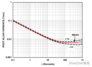 Allan 方差 關(guān)系式還有助于深入了解最佳積分時(shí)間(τ = t2 – t1)。該曲線上的最低點(diǎn)通常被確定為運(yùn)行中偏置穩(wěn)定度。通過(guò)設(shè)置積分時(shí)間 ,使其等于與所用陀螺儀的Allan方差曲線上最低點(diǎn)相關(guān)的積分時(shí)間,可優(yōu)化駛向估算結(jié)果。