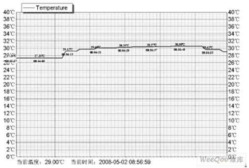 圖4是用Visual C++開發(fā)的mSever端溫度數(shù)據(jù)可視化顯示的界面,圖中顯示的是1個節(jié)點(diǎn)的溫度變化實(shí)時曲線。