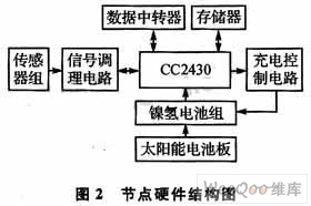 本設(shè)計選用的核心芯片是TI公司推出的ZigBee芯片CC2430。它以8051微處理器為內(nèi)核,自身攜帶的射頻收發(fā)器用來實現(xiàn)無線傳感器網(wǎng)絡(luò)節(jié)點的通信,提供了4路I/O口來控制傳感器的打開和關(guān)閉。傳感器將相應(yīng)的環(huán)境數(shù)據(jù)變成電壓、電流等信號送給信號調(diào)理電路,經(jīng)相關(guān)調(diào)理后送到CC2430的ADC接口進行A/D采樣,最后CC2430將得到的A/D值存人1個外接的64 Kb的存儲器中。當(dāng)節(jié)點作為網(wǎng)絡(luò)中的匯聚節(jié)點時,CC2430的2路I/O口被設(shè)置成UART0串口Tx和Rx,用于和數(shù)據(jù)中轉(zhuǎn)器進行串口通信。對于能源供應(yīng)部分,為保證節(jié)點長期穩(wěn)定工作,選用2300 mA的鎳氫充電電池,2組鎳氫電池采用雙電源供電模式。軟件通過控制2組鎳氫電池的切換實現(xiàn)對節(jié)點的輪流供電,并在電池電壓不足時控制太陽能電池板對其進行充電。