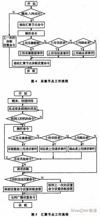 為便于管理和調(diào)度,節(jié)點所要實現(xiàn)的功能都是將其定義為事件進行處理的。每個事件完成相應(yīng)功能。將事件按一定關(guān)系串接,就能實現(xiàn)節(jié)點工作時要完成的系統(tǒng)功能。采集節(jié)點和匯聚節(jié)點的工作流程如圖4、圖5所示。
