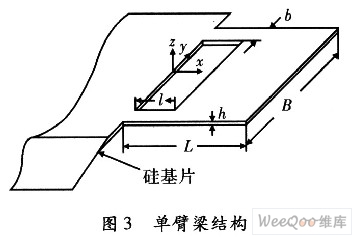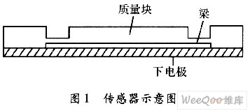 壓阻式加速度傳感器的彈性元件一般采用硅梁外加質(zhì)量塊,質(zhì)量塊由懸臂梁支撐,并在懸臂梁上制作電阻,連接成測(cè)量電橋。在慣性力作用下質(zhì)量塊上下運(yùn)動(dòng),懸臂梁上電阻的阻值隨應(yīng)力的作用而發(fā)生變化,引起測(cè)量電橋輸出電壓變化,以此實(shí)現(xiàn)對(duì)加速度的測(cè)量。