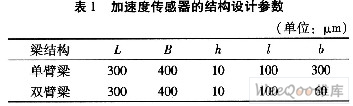 Aasys是一個(gè)可在微機(jī)上使用的綜合性有限元軟件,是微機(jī)電系統(tǒng)設(shè)計(jì)中廣泛使用的有限元分析軟件。通過(guò)有限元的分析計(jì)算可以預(yù)測(cè)懸臂梁上引力分布、固有頻率、可測(cè)最大加速度等,進(jìn)而指導(dǎo)梁結(jié)構(gòu)參數(shù)的選取。經(jīng)過(guò)對(duì)梁結(jié)構(gòu)有限元的計(jì)算分析選取單臂梁、雙臂梁結(jié)構(gòu)參數(shù),如表1所示。