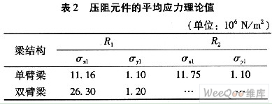 由有限元計(jì)算結(jié)果,可以得到單臂梁和雙臂梁上在10 000gn加速度作用下壓阻元件所受的平均應(yīng)力,如表2所示。