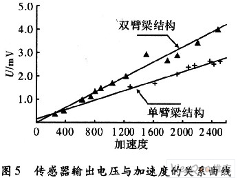 對(duì)制作的加速度傳感器樣品,在馬希特?fù)翦N上進(jìn)行了大量地沖擊標(biāo)定測(cè)試,測(cè)試結(jié)果表明:設(shè)計(jì)和加工制作的加速度計(jì)樣品在進(jìn)行加速度的沖擊時(shí),有較好的信號(hào)輸出,單臂梁結(jié)構(gòu)的加速度計(jì)的靈敏度為1μV/gn;雙臂梁結(jié)構(gòu)的加速度計(jì)的靈敏度為1.6μV/gn,與理論設(shè)計(jì)值基本吻合。