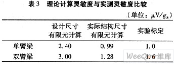 對(duì)于懸臂梁結(jié)構(gòu)的硅微型加速度傳感器,在其它結(jié)構(gòu)尺寸相同的情況下,梁的厚度對(duì)加速度傳感器的靈敏度影響最大,基本上是反比的關(guān)系。這是由于在同樣的載荷下,梁厚與應(yīng)力大小成反比,而應(yīng)力大小直接影響靈敏度,應(yīng)力越大靈敏度越高。由于加工出芯片梁的厚度比設(shè)計(jì)值偏差較大,故其測(cè)試靈敏度比設(shè)計(jì)值小,如表3所示。