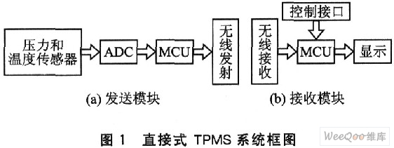 TPMS系統(tǒng)分為直接式TPMS和間接式TPMS兩種。其中間接式TPMS是通過汽車ABS系統(tǒng)的輪速傳感器來比較車輪之間的轉(zhuǎn)速差別,以達(dá)到監(jiān)視胎壓的目的,其精度較低。直接式TPMS工作原理是利用安裝在每一個(gè)輪胎里的壓力傳感器和溫度傳感器來直接測(cè)量輪胎的壓力和溫度,并對(duì)各輪胎氣壓進(jìn)行顯示及監(jiān)控。它的優(yōu)點(diǎn)是,在輪胎壓力過高、過低,輪胎緩慢漏氣或溫度異常變化時(shí),可以及時(shí)向車載無線接收器報(bào)警,有效防止爆胎,同時(shí)監(jiān)測(cè)所有輪胎的狀況,并且系統(tǒng)對(duì)汽車的行駛速度沒有要求。