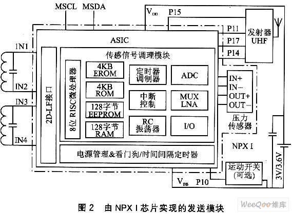 從20世紀(jì)90年代開始,GE公司通用NovaSensor就提供壓力傳感器及TPMS系統(tǒng)方案。2004年其NPX系列壓力傳感器開始供貨,NPX I芯片整合了壓力、溫度傳感器及8位RISC MCU,NPX II與NPX I相比較又整合了慣性感應(yīng)器;2006年推出的NPX III除具有以上功能外,更把RF發(fā)射電路整合一體,成為單芯片方案。NPX系列芯片由于性能優(yōu)越、工作穩(wěn)定,被世界一流汽車配套廠商廣泛采用。本文介紹基于GE公司NPX I芯片的TPMS系統(tǒng)設(shè)計(jì)方案及實(shí)現(xiàn)方法。