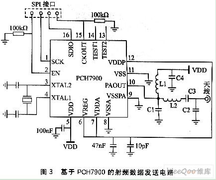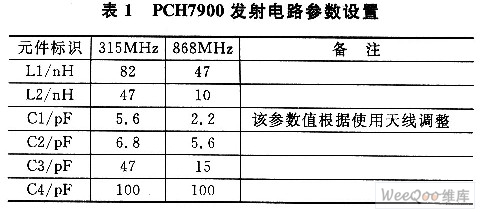 為了保證系統(tǒng)在較低電流消耗的情況下仍有較高的發(fā)射功率和接收靈敏度,系統(tǒng)選用了NXP公司的高集成度的單芯片發(fā)射器PCH7900。PCH7900芯片集成度非常高,只需很少的外圍元件就可以用于315/434/868/915MHz、數(shù)據(jù)速率高達(dá)40 kbps的ASK和FSK調(diào)制發(fā)射機(jī);赑CH7900的射頻數(shù)據(jù)發(fā)送電路如圖3所示。其中315 MHz和868 MHz發(fā)射頻率的電路參數(shù)按表1設(shè)置。