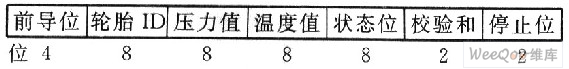 為實(shí)現(xiàn)系統(tǒng)輪胎模塊和接收模塊之間可靠的無線通信,發(fā)射機(jī)和接收機(jī)之問必須以一定的協(xié)議進(jìn)行通信。發(fā)射模塊中的MCU發(fā)送數(shù)據(jù)時(shí)以數(shù)據(jù)幀方式進(jìn)行,通過數(shù)據(jù)幀的前導(dǎo)位喚醒接收模塊,其幀格式如下: