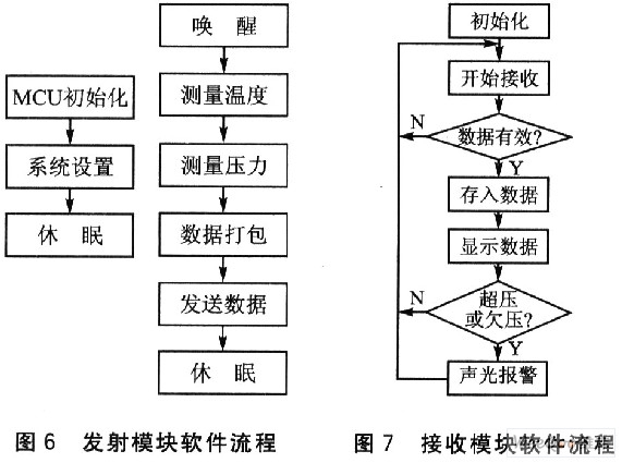 因?yàn)榘l(fā)送模塊的設(shè)計(jì)要考慮節(jié)電功能,所以模塊平時(shí)處于休眠狀態(tài),當(dāng)接收到加速度喚醒信號(hào)時(shí)進(jìn)行測(cè)量并傳輸數(shù)據(jù),其程序流程如圖6所示。接收模塊的程序流程如圖7所示。接收模塊上電后,首先配置MCU和RF接收芯片,然后開始接收數(shù)據(jù)。當(dāng)收到數(shù)據(jù)后,MCU校驗(yàn)輪胎1D,當(dāng)確認(rèn)輪胎ID有效后,MCU處理該數(shù)據(jù)并顯示數(shù)據(jù)。最后,MCU根據(jù)設(shè)置的閾值決定是否作出超壓、欠壓及漏氣等報(bào)警動(dòng)作。