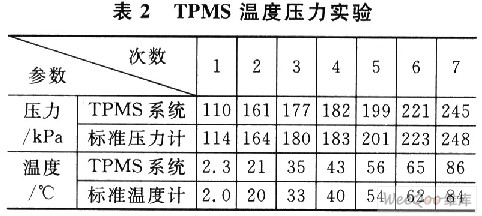 由本文設(shè)計(jì)的TPMS系統(tǒng)在與實(shí)際工作情況相類似的情況下做了仿真實(shí)驗(yàn),其中實(shí)驗(yàn)壓力變化范圍為100~250 kPa,輪胎溫度變化范圍為O~90℃。本文設(shè)計(jì)的TPMS系統(tǒng)測(cè)量數(shù)據(jù)與標(biāo)準(zhǔn)壓力計(jì)與溫度計(jì)的比較情況如表2所列。
