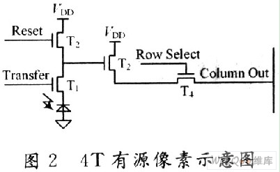 轉移管T1被用來將光敏二極管連接至源跟隨器T3,并通過復位管T2與VDD相連。T3的柵極與T1和T2之間的N+擴散區(qū)相連。與3T結構的APS相比,減少了與T3的柵極相關的漏電流效應。源跟隨器T3的作用是實現(xiàn)對信號的放大和緩沖,改善APS的噪聲問題。T4是用來將信號與列總線相連。其工作過程是:首先進入“復位狀態(tài)”,T2打開,對光敏二極管復位;然后進入“取樣狀態(tài)”,T2關閉,光照射到光敏二極管上產生光生載流子,并通過源跟隨器T3放大輸出;最后進入“讀出狀態(tài)”,這時行選通管T4打開,信號通過列總線輸出。