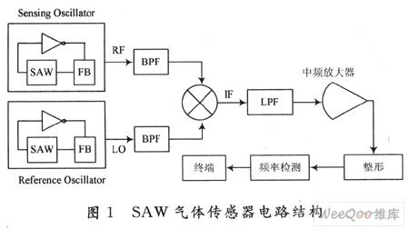 常用的SAW氣體傳感器由SAW器件、敏感薄膜和信號處理電路組成。在實際使用中,為了使聲表面波傳感器使用更加方便,需要最終設計制造出一塊集環(huán)境感應、數(shù)據讀出和數(shù)據處理為一體的專用電路,因此該電路最終將是一塊大規(guī)模的混合信號處理電路,是整個傳感器電路的一個重要模塊,需要仔細設計和優(yōu)化。對于聲表面波氣體傳感器的處理電路設計,文獻[2,3]分別報道了采用相關高頻震蕩電路實現(xiàn)傳感器信號處理的方法。文獻[2]中采用了改進的皮爾斯振蕩器和 DDS檢測法對其信號進行處理。2005年,Shen Yutang等人提出了一種新的聲表面波傳感器電路設計方案,采用了模擬與數(shù)字結合的方法,利用雙通道結構取得了較好的結果。