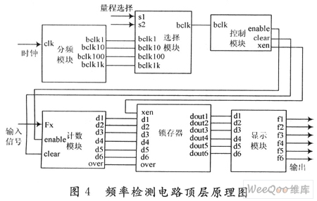 通過對上述原理的分析,給出頻率計的整體設計方案如圖3所示。該頻率檢測電路劃分為6個子模塊電路。通過各個分塊設計,可以利用FPGA的優(yōu)勢與可編程性,自頂向下,分塊地實現(xiàn)各模塊的功能。