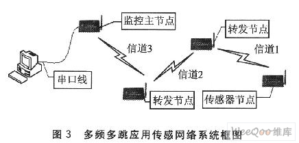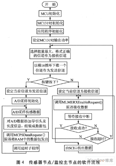 圖3中僅列出了最簡單的組網(wǎng)方式。如果地形需要所有的傳感器節(jié)點按線型排開(如在煤礦隧道中的傳感網(wǎng)絡),則可以采用上述組網(wǎng)方法。組網(wǎng)采用的是 ZigBee技術,利用現(xiàn)代高級無線芯片(如Freescale公司的MC13192芯片),每個節(jié)點可以在網(wǎng)絡初始化時對所有信道進行能量檢測,從而選擇最干凈的信道進行信號的發(fā)送或轉發(fā)。如果地形復雜,傳感器節(jié)點遍布,則可以采用一個轉發(fā)節(jié)點負責周圍幾個傳感器節(jié)點的方式,信道選擇的編程基本思想不變。
