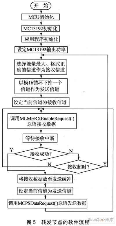 下面就以基于MC13192這一ZigBee射頻的節(jié)點組網(wǎng)為例,給出編程思想流程。編程基于Freescale公司提供的開發(fā)軟件平臺SMAC。圖2 中,傳感器節(jié)點、監(jiān)控主節(jié)點可以采用按鍵選擇相應的功能,軟件流程如圖4所示。轉發(fā)節(jié)點,則可以采用圖5所示的編程思想。