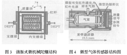 圖4 是一種體積僅為1 cm2 的二氧化碳氣體傳感器結(jié)構(gòu)示意圖。該氣體傳感器的工作機理是基于非散射的紅外雙光束、雙波長的測量原理 。它的結(jié)構(gòu)包括一個常規(guī)的小型紅外光源、一個氣室和一個紅外探測單元。紅外探測單元由兩個單晶硅微型熱輻射儀、一個寬帶濾波器和一個微型可變紅外濾光片構(gòu)成,參考信號源可以補償由于光源污染產(chǎn)生的測量信號衰減帶來的影響。在二氧化碳體積分數(shù)2000 ×10 - 6的樣氣中,該傳感器具有20 ×10 - 6的分辨力(1σ) ,時間常數(shù)為3 s.