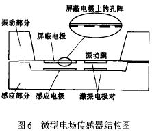 電場傳感器是基于導(dǎo)體在電場中產(chǎn)生感應(yīng)電荷的原理。圖6 提供了一種基于MEMS 技術(shù)設(shè)計的微型電場傳感器的結(jié)構(gòu)圖。傳感器由振動和感應(yīng)兩大部分組成。振動部分的核心是振動膜,由氮化硅(Si3N4)薄膜制備,可以在圖示的垂直方向上振動。感應(yīng)電極、屏蔽電極和激振電極對由分別生長在振動膜和感應(yīng)部分上的金屬電極構(gòu)成。屏蔽電極接地,其上有孔形陣列。傳感器工作時,激振電極對連接交流電壓源,通過兩個電極間的庫侖力作用引起振動膜垂直振動。調(diào)節(jié)交流電壓頻率,使振動膜在諧振點附近達到預(yù)定的振幅。此時感應(yīng)電極接受經(jīng)過屏蔽電極周期性屏蔽的電場,產(chǎn)生感應(yīng)電流,經(jīng)前置放大后接外部檢測電路。微電場傳感器彌補了一般電場傳感器體積大、能耗高的缺點,可以應(yīng)用于各種環(huán)境下靜電場及低頻電場的測量,有著廣闊的應(yīng)用前景 。