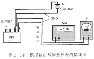 單獨使用一個PPT,能代替?zhèn)鹘y(tǒng)的模擬式壓力傳感器。其最大優(yōu)點是不需要校準即可達到高精度指標。PPT模擬輸出與測量儀表的接線如圖2所示。用戶既可通過數(shù)字電壓表(DVM)讀取壓力的精確值,亦可利用模擬式電壓表(V)來觀察壓力的變化過程及變化趨勢。對PPT進行設置后,它還能在傳送壓力數(shù)據(jù)的同時,接收來自控制處理器的閥門控制信號,以實現(xiàn)壓力自動調(diào)節(jié),這對于壓力測控系統(tǒng)非常有用。閥門控制數(shù)據(jù)可以和壓力數(shù)據(jù)無關(guān)。