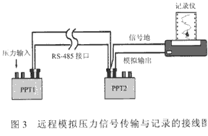 PPT的模擬信號可直接送給記錄儀來記錄壓力波形,但在遠距離傳輸模擬信號時很容易受線路干擾及環(huán)境噪聲的影響,還會造成信號衰減。為解決上述問題,可按圖3所示,在終端增加一個PPT。首先由PPT1發(fā)送壓力數(shù)據(jù),然后遠程傳輸給 PPT2,再將PPT2的模擬輸出接記錄儀。這種方法適用于RS-485接口,傳輸距離可達數(shù)千米。若采用帶RS-232接口的PPT系列傳感器,需增加驅(qū)動器和中繼器。該方案的另一優(yōu)點是傳輸速率快,當波特率選28800bit/s時,數(shù)據(jù)傳輸所造成的延遲時間不超過2ms。