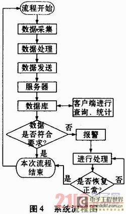 系統(tǒng)流程如圖4所示。針對不同的環(huán)境,根據(jù)需要采集的參數(shù)類型(溫濕度數(shù)據(jù)、煙感數(shù)據(jù)、煤氣感應(yīng)數(shù)據(jù)等)選擇相應(yīng)的傳感器,構(gòu)成相應(yīng)的傳感器子系統(tǒng),傳感器子系統(tǒng)將采集到的數(shù)據(jù)經(jīng)過處理后發(fā)送到服務(wù)器,服務(wù)器將接收到的數(shù)據(jù)自動存入數(shù)據(jù)庫,當數(shù)據(jù)超出規(guī)定的范圍時啟動報警器進行報警,提醒值班人員及時進行處理。值班人員也可以隨時通過客戶端軟件訪問服務(wù)器,對環(huán)境參數(shù)進行查詢、統(tǒng)計、生成報表,隨時掌握環(huán)境狀態(tài)。