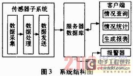 運用傳感器網(wǎng)絡(luò)進行環(huán)境監(jiān)測的系統(tǒng)結(jié)構(gòu)圖如圖3所示,系統(tǒng)硬件設(shè)備由傳感器子系統(tǒng)、服務(wù)器、客戶機和報警器組成。