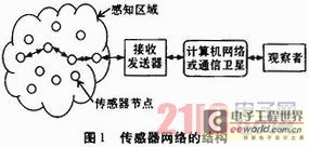 圖1給出了一個典型的傳感器網(wǎng)絡(luò)的結(jié)構(gòu)。這個網(wǎng)絡(luò)由傳感器節(jié)點、接收發(fā)送器、計算機網(wǎng)絡(luò)或通信衛(wèi)星、觀察者等部分構(gòu)成。傳感器節(jié)點散布在指定的感知區(qū)域內(nèi),每個節(jié)點都可以感知信息,感知信息通過多跳的方式傳輸給接收發(fā)送器,接收發(fā)送器再將感知信息送到計算機網(wǎng)絡(luò)或通信衛(wèi)星,通過計算機網(wǎng)絡(luò)或通信衛(wèi)星實現(xiàn)觀察者與傳感器之間的數(shù)據(jù)通信。