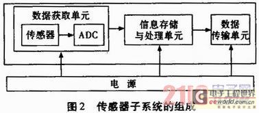 傳感器、感知對象和觀察者是傳感器網(wǎng)絡(luò)的三個基本要素。網(wǎng)絡(luò)中的傳感器節(jié)點(或稱為傳感器子系統(tǒng))由電源、數(shù)據(jù)獲取單元、信息存儲與處理單元和數(shù)據(jù)傳輸單元構(gòu)成,如圖2所示。電源為傳感器提供正常工作所必需的能源。數(shù)據(jù)獲取單元用于感知、獲取外界的信息,并將其轉(zhuǎn)換為數(shù)字信號。信息存儲與處理單元對數(shù)據(jù)獲取單元傳來的信息進行必要的處理、保存,數(shù)據(jù)傳輸單元負責與其他傳感器或接收發(fā)送器之間的通信。觀察者是傳感器網(wǎng)絡(luò)的用戶,是感知信息的接受者或任務(wù)管理者,觀察者可以是人,也可以是計算機或其他設(shè)備。