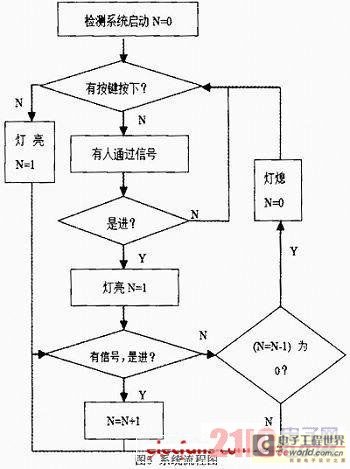 系統(tǒng)流程圖如圖5所示。其中N表示洗手間內(nèi)現(xiàn)有的人數(shù),當(dāng)檢測(cè)系統(tǒng)電源連上后,光電傳感器開始檢測(cè),但系統(tǒng)不知道洗手間內(nèi)此時(shí)是否有人,默認(rèn)是無(wú)人,因而燈是不會(huì)亮的,這時(shí)按鍵可以用來(lái)對(duì)系統(tǒng)進(jìn)行調(diào)整。當(dāng)光強(qiáng)增大到一定值時(shí),檢測(cè)系統(tǒng)自動(dòng)停止工作。
