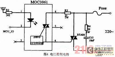 本系統(tǒng)由光電傳感器檢測(cè)洗手間內(nèi)是否有人,單片機(jī)進(jìn)行計(jì)數(shù),當(dāng)N不為零時(shí),單片機(jī)會(huì)向與MOC3061芯片引腳相連的端口輸送信號(hào),然后通過可控硅來(lái)控制燈的開、關(guān)。其中R3是雙向可控硅的門極電阻,當(dāng)可控硅靈敏度較高時(shí),門極阻抗也很高,并上R3可提高抗干擾能力。 39Ω電阻和0.01μF電容組成浪涌吸收電路,防止浪涌電壓損壞雙向可控硅。其電路圖如圖4所示。