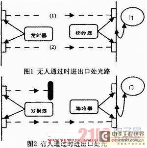 本系統(tǒng)中設(shè)計(jì)了兩個(gè)對(duì)射型光電傳感器,當(dāng)有人通過時(shí),若是光路(1)先檢測(cè)到信號(hào),則表明此人是進(jìn)洗手間,計(jì)數(shù)器加1,若是光路(2)先檢測(cè)到信號(hào),則表明此人是出洗手間,計(jì)數(shù)器減1,即兩個(gè)對(duì)射型光電傳感器是用來(lái)檢測(cè)和判斷是否有人進(jìn)出洗手間。