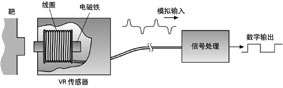 圖1:在VR傳感器中,模擬信號(hào)必須經(jīng)過信號(hào)處理電路使輸出與轉(zhuǎn)速成比例的脈沖信號(hào)。