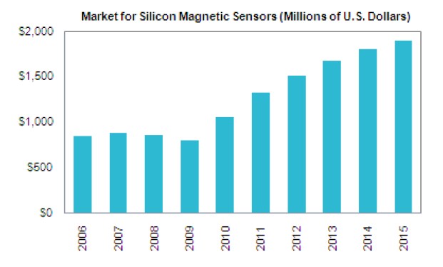 磁傳感器進(jìn)入了加速發(fā)展的時(shí)代。度過(guò)了2009的低潮,到了2010基于硅的磁傳感器有了快速的增長(zhǎng),覆蓋了各個(gè)領(lǐng)域,特別是在汽車(chē)和消費(fèi)市場(chǎng)領(lǐng)域。從2009年到2010年數(shù)量增加了38%。預(yù)期這個(gè)市場(chǎng)在2015年將會(huì)達(dá)到19億美金,比2010年的11億美金,復(fù)合增長(zhǎng)率為12%。