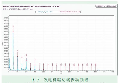 發(fā)電機驅(qū)動端振動頻譜見圖7所示。從驅(qū)動端的振動頻譜來看,1~6倍發(fā)電機轉(zhuǎn)頻處均存在峰值,且峰值相對較高,符合機械松動的征兆,表明發(fā)電機驅(qū)動端軸承處存在一定的磨損,為軸磨損或者軸承座磨損。整體振動值處于黃色預(yù)警期,可繼續(xù)運行,但要經(jīng)常跟蹤振動變化趨勢,需要定期潤滑維護。