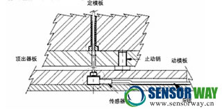 滑動式傳感器通常安裝在已有的推件銷下的頂出板上。而在進行高溫模塑時,或者把低壓傳感器用于小頂銷時,滑動式傳感器一般會被安裝在模具的動模板上,這時推件銷通過頂出器套而起作用或者另使用一個過渡銷。過渡銷具有兩個作用,一是在使用現(xiàn)有頂出器的情況下,它能使滑動式傳感器免受脫模壓力的干擾。另一作用是當(dāng)生產(chǎn)周期短、脫模速度快時,它能使傳感器不受頂出板快速加速和減速的影響。