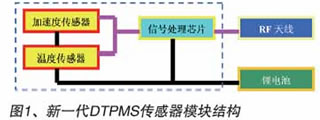 新一代DTPMS將MEMS的加速度傳感器和溫度傳感器與信號處理電路集成在一塊芯片中。傳感器模塊的構(gòu)成部件只有集成MEMS傳感器和信號處理電路的胎壓監(jiān)測器芯片、電池以及向本車駕駛臺傳輸計測結(jié)果的天線這三個部分,如圖1所示。由此使得內(nèi)置傳感器模塊的重量大大降低,先前安裝在輪胎氣門嘴上的已有傳感器模塊重量原為1個37g,而新一代DTPMS粘貼在輪胎上的模塊重量僅為11g。其電池壽命可達到與輪胎一樣的6年。