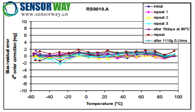 圖 3: 剩余偏置隨溫度而變化(經(jīng)過 4 階多項(xiàng)式校正之后) 包括在 85℃下老化、并以 1000g 沖擊 10 天
