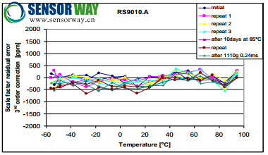 圖 4: 剩余標(biāo)度因數(shù)隨溫度而變化 (經(jīng)過 2 階多項(xiàng)式校正之后) 包括溫度遲滯
