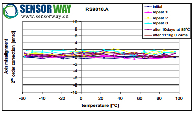 圖 5: 在整個(gè)溫度范圍的軸偏穩(wěn)定性(經(jīng)過2 階多項(xiàng)式校正之后), 沖擊和加速老化